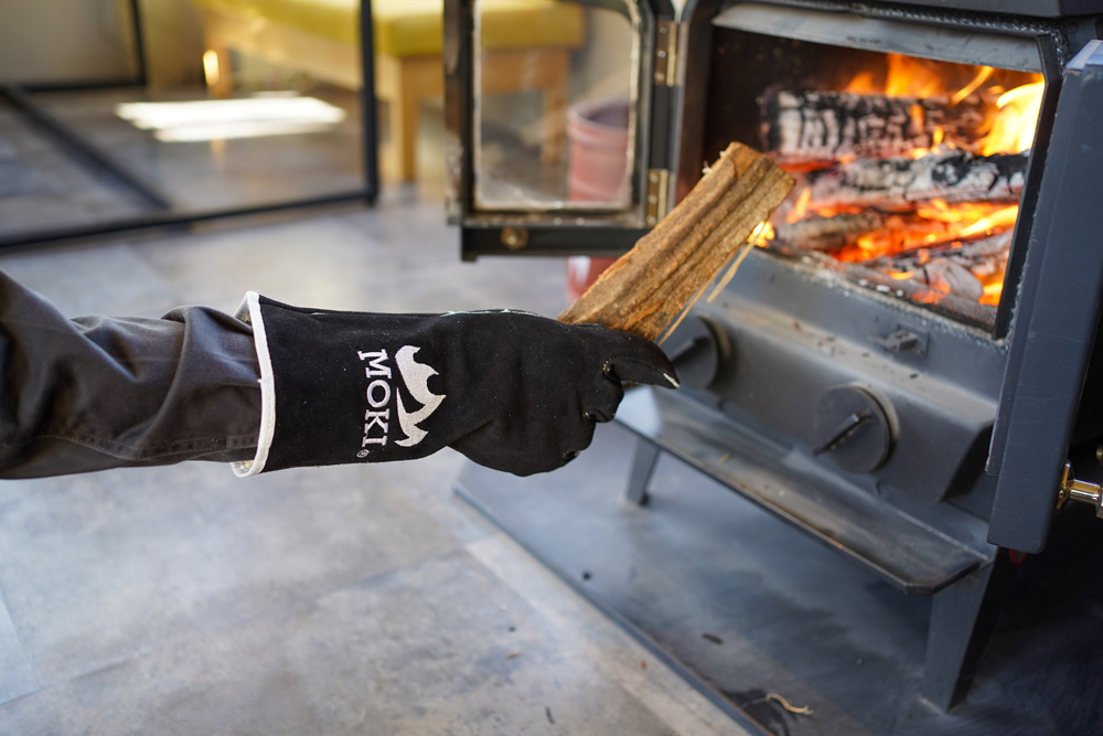薪がしっかりつかめる5本指タイプの耐火グローブ。