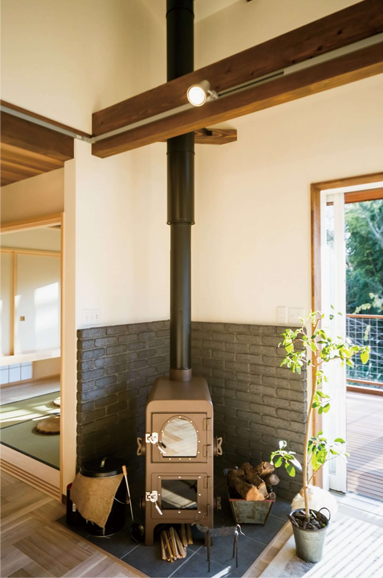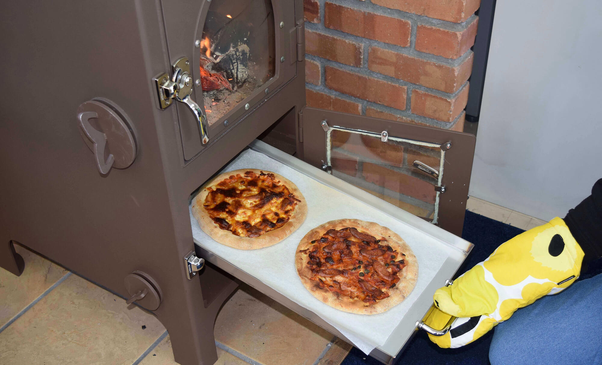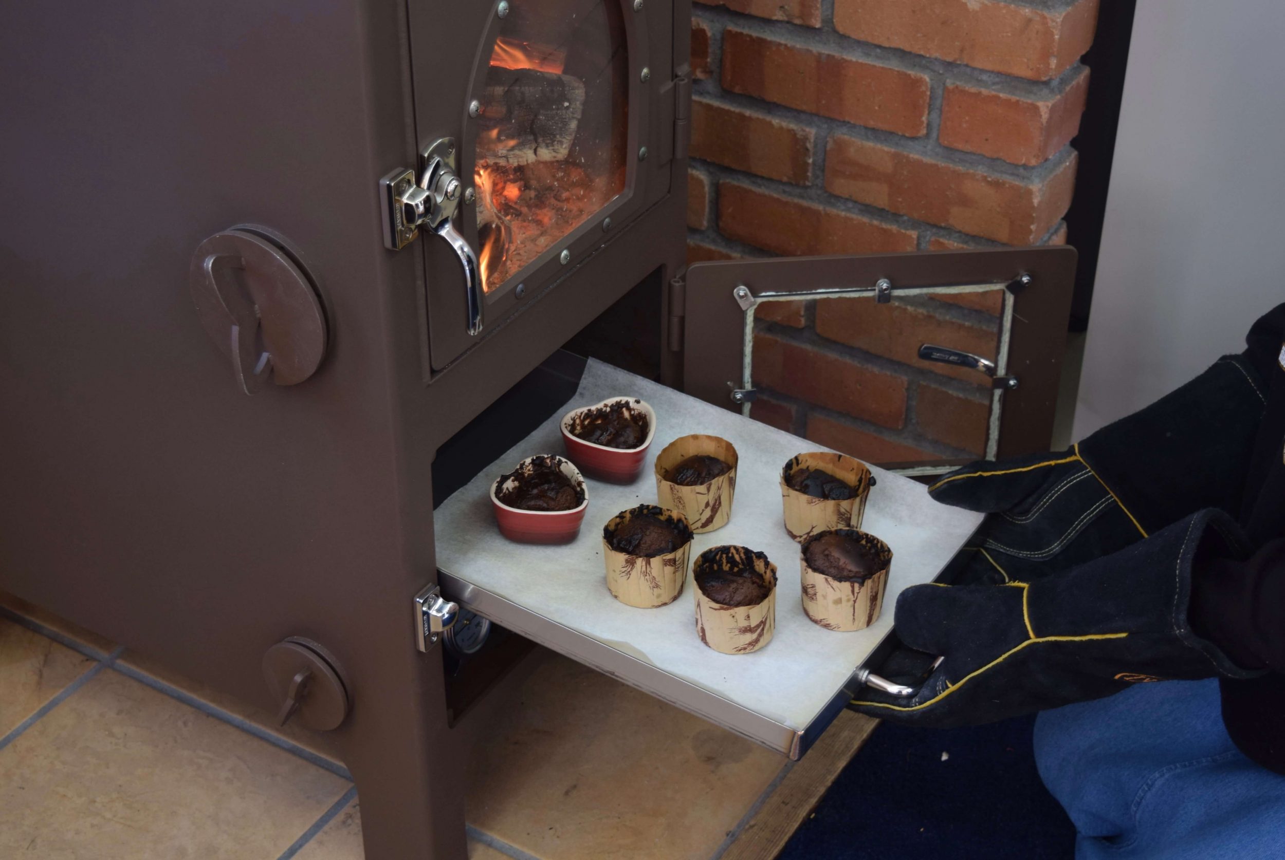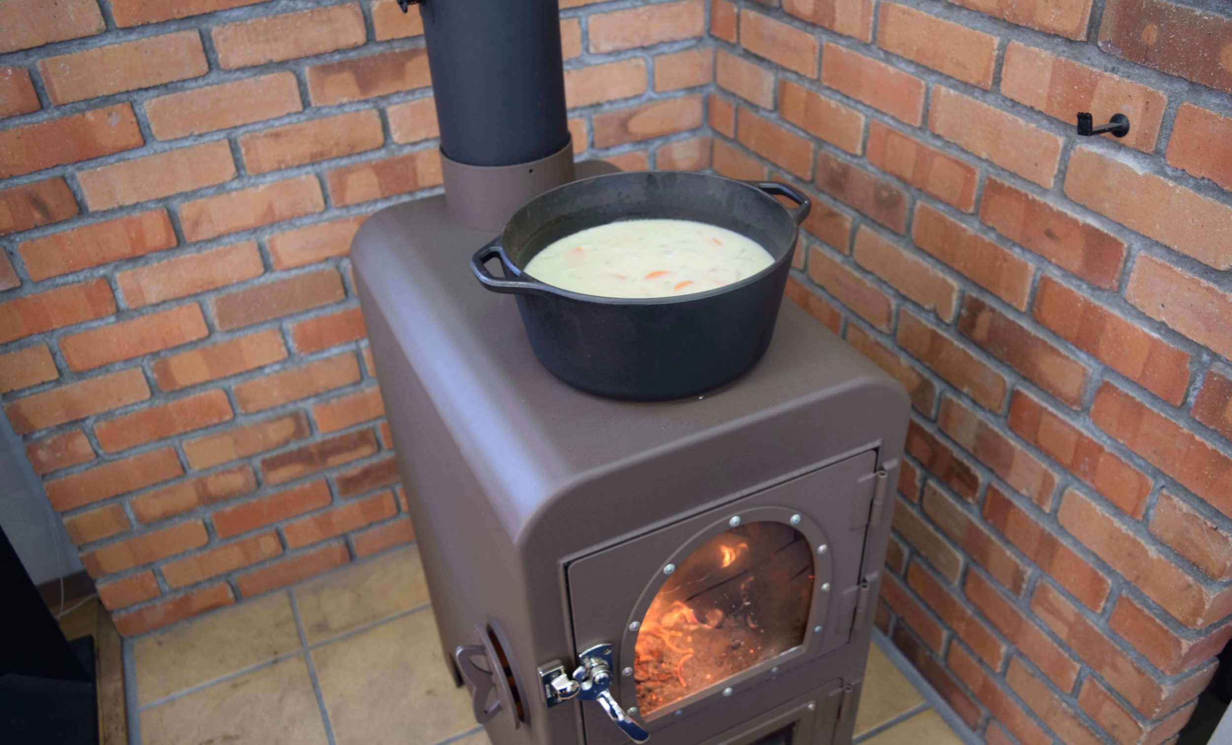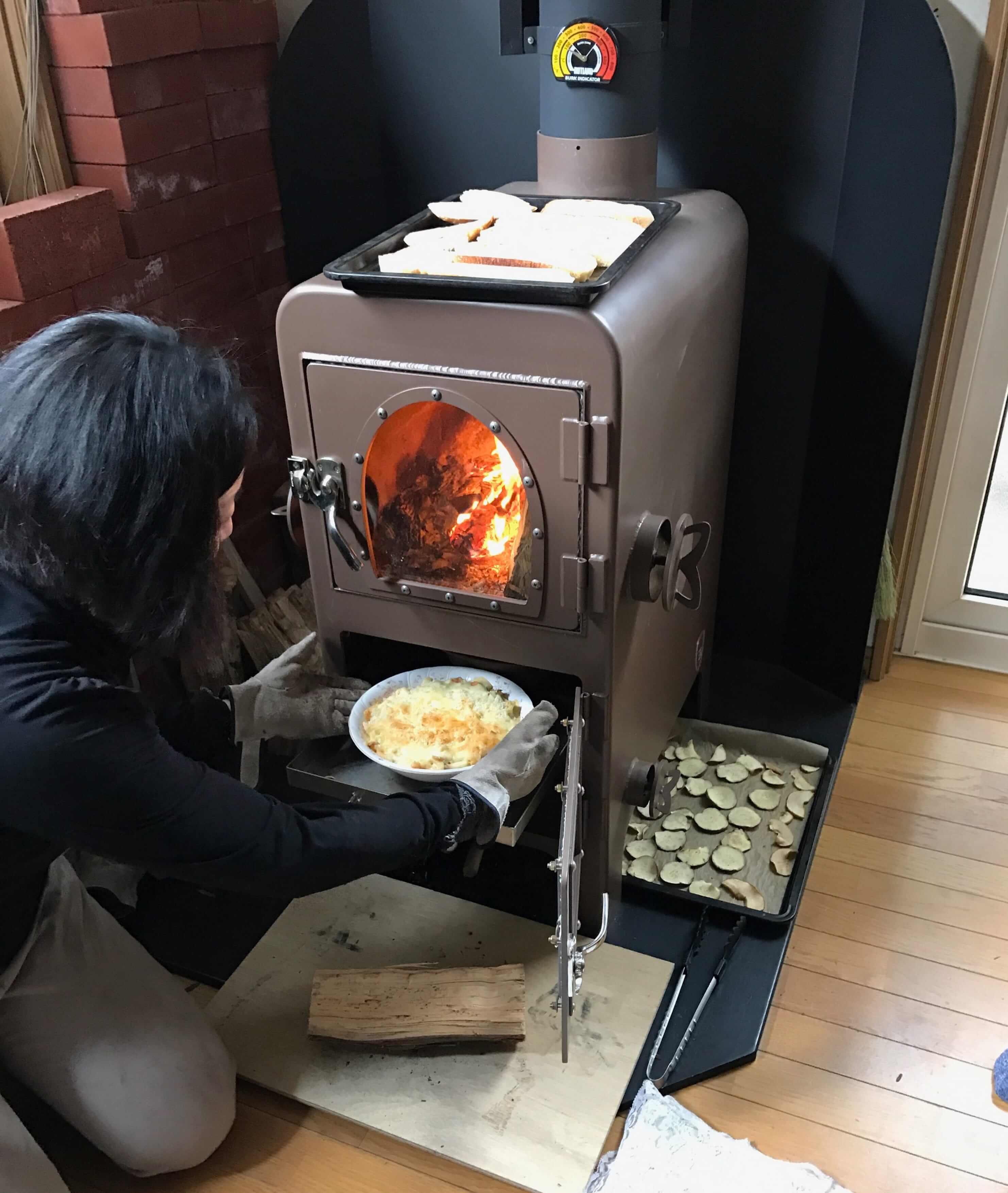 アース色でクラシックな薪ストーブ。オーブンを用いた調理だけでなく天板を使えば煮炊きも可能