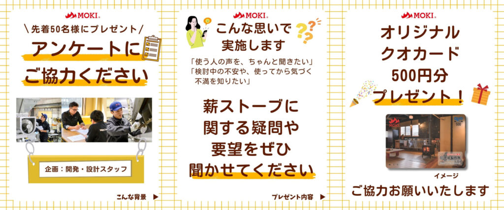 当社では、薪ストーブの新商品開発および既存商品の改良を目的としたアンケートを実施いたします。